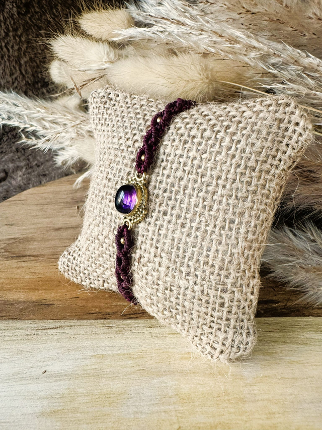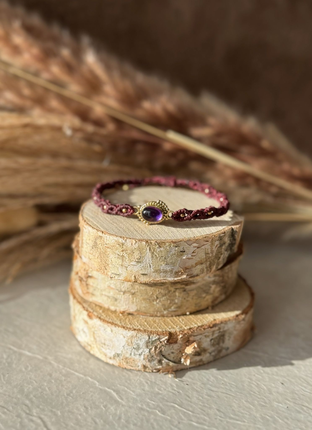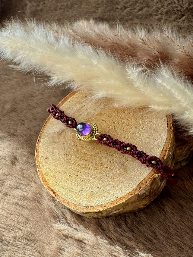 🧵 Fil prune et améthyste sertie de laiton (2 × 1 cm), entourée de dix perles en laiton de 2 mm. Chaque lien se termine par une perle de 4 mm.